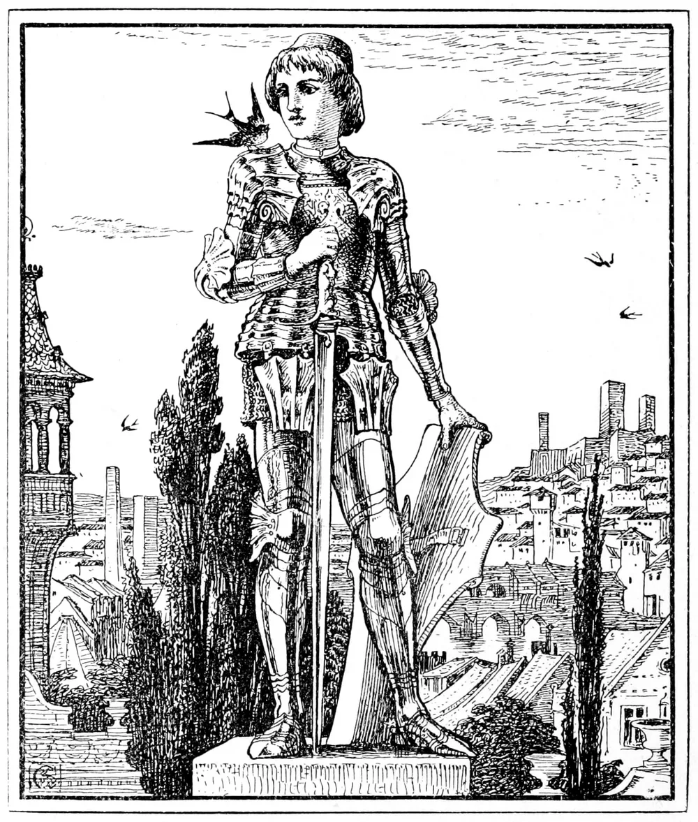 높이 솟은 기둥 위에 보석들로 치장한 행복한 왕자 동상이 있고 사람들은 그 동상을 찬미한다.